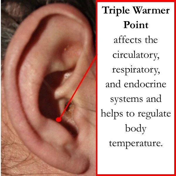 There are more than 200 reflexology points on the ears that correspond to the entire body. Some of these points support multiple body systems. Triple warmer is a point that is used both in Traditional Chinese Medicine and in ear reflexology. It supports the circulatory, respiratory, and endocrine systems and helps with body temperature regulation.